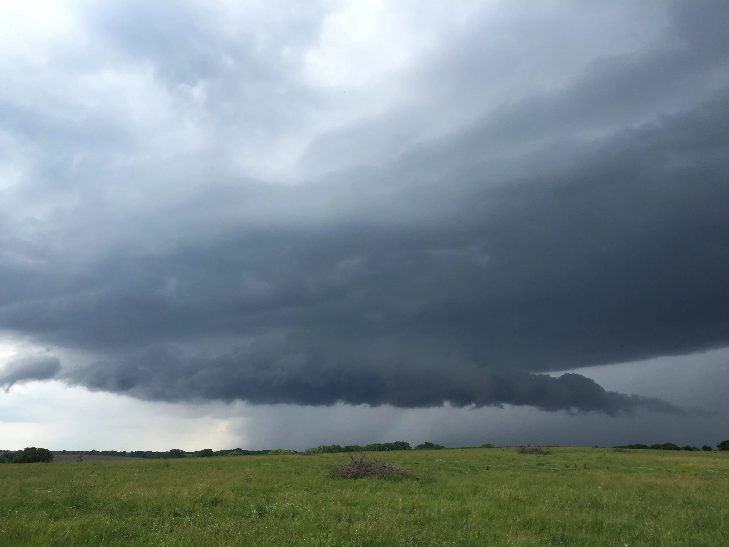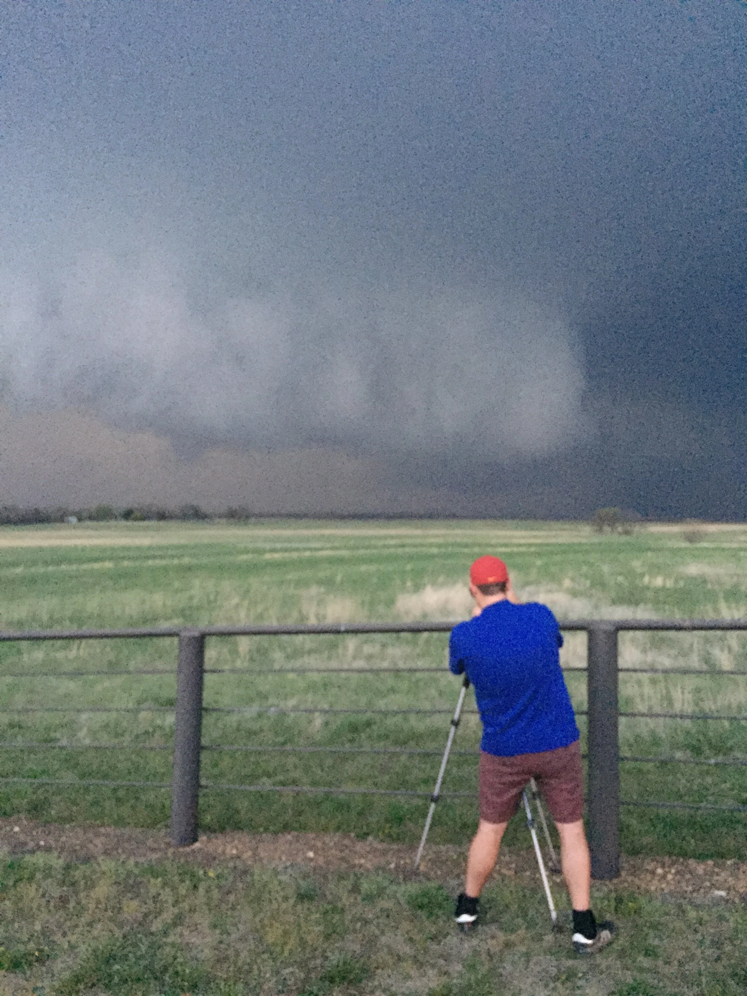 On my way home, I noticed a new cell that popped up just south of Sayre, Oklahoma. I watched the updraft billow upward for the better part of 30 minutes as I drove toward it. Not thinking much of the new storm I decided to drive through it to keep on track to get home before 4 am. As I was just emerging from the hail core, my phone delivered a WEA alert for a tornado warning. Confused I opened up my iPad to note that indeed this cell had become tornado-warned. Knowing I was out of the path of the updraft I looked behind me to see if I could see anything in the vicinity of the updraft and low and behold I noticed a tapered lowering resembling a broad funnel cloud. I exited the Interstate just west of Sayre and hit the frontage road heading back to the west. There I set up to take a few shots of the distant tornado as it crossed the interstate. After witnessing its demise and calling in the report, I resumed my long drive back to Kansas City.